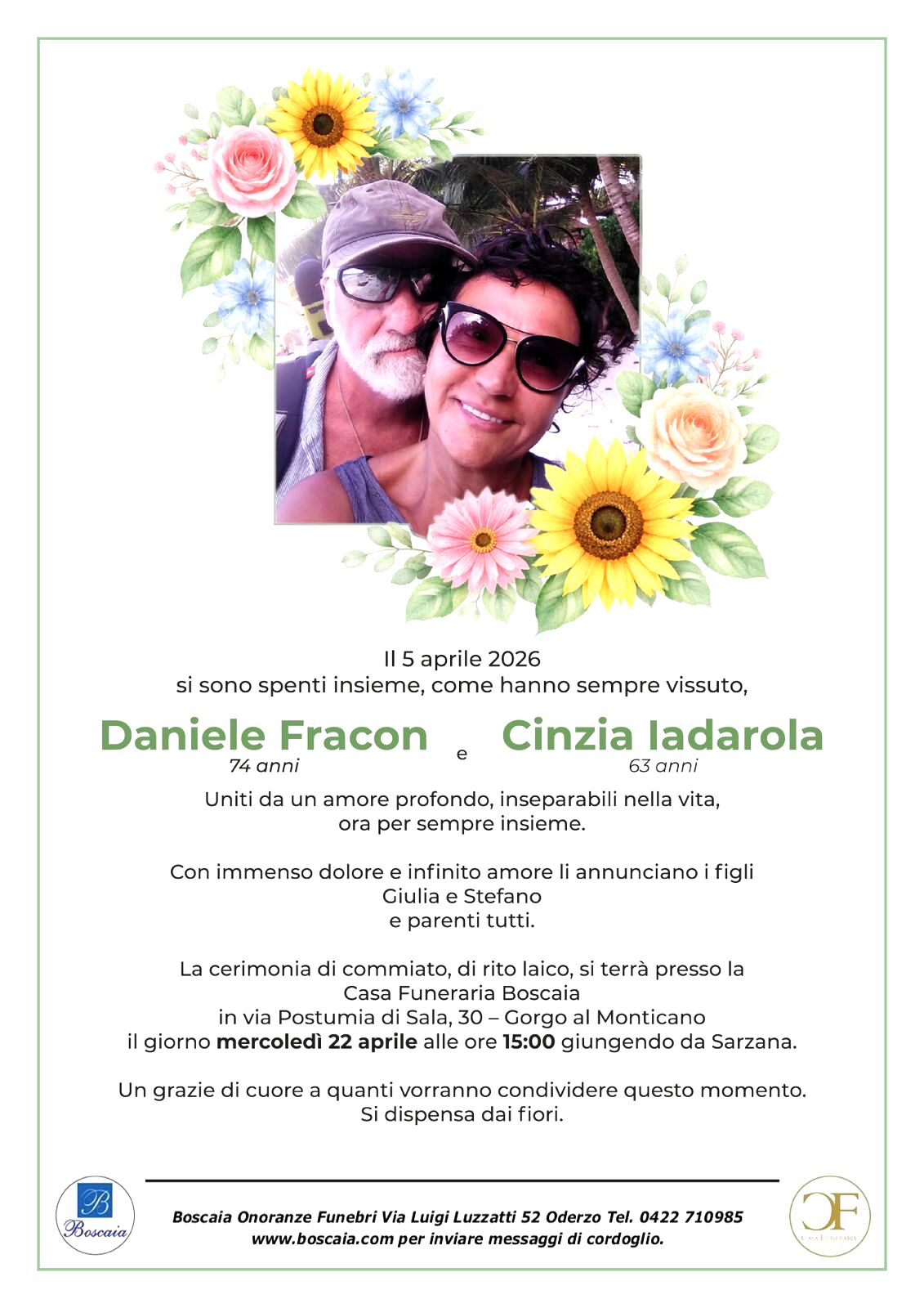 Necrologio Fracon Daniele Idarola Cinzia onoranze funebri Boscaia Oderzo